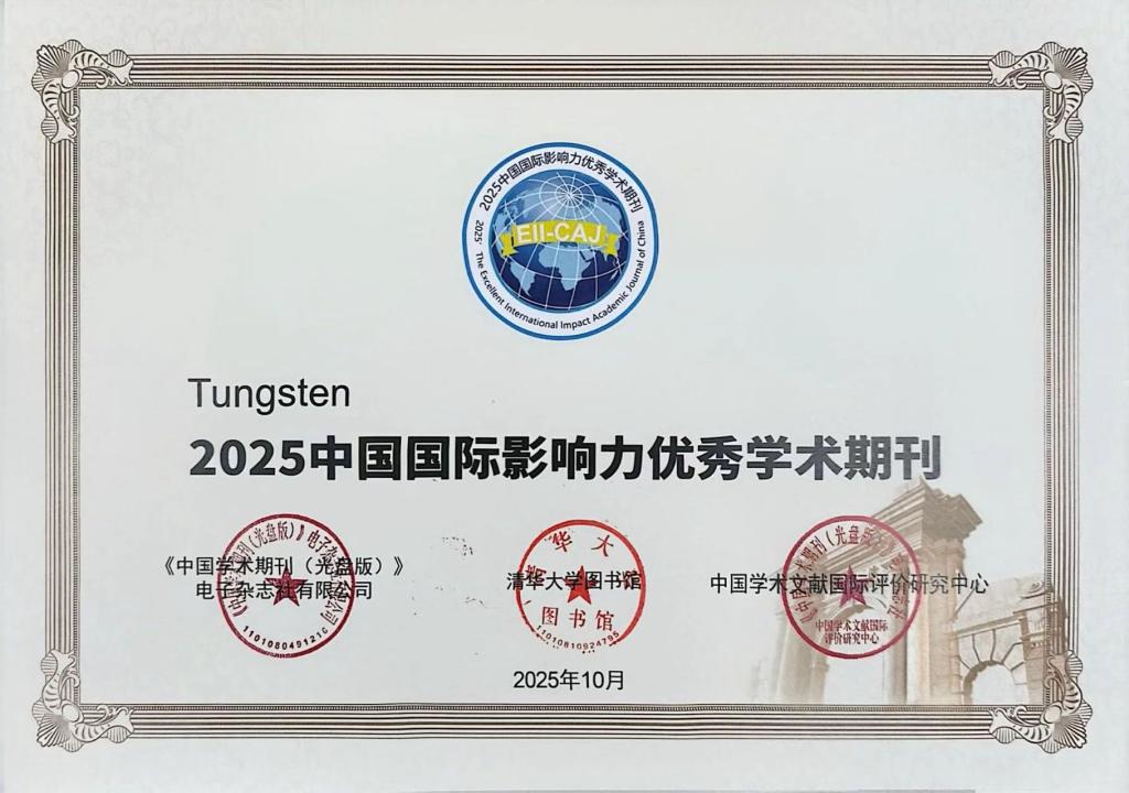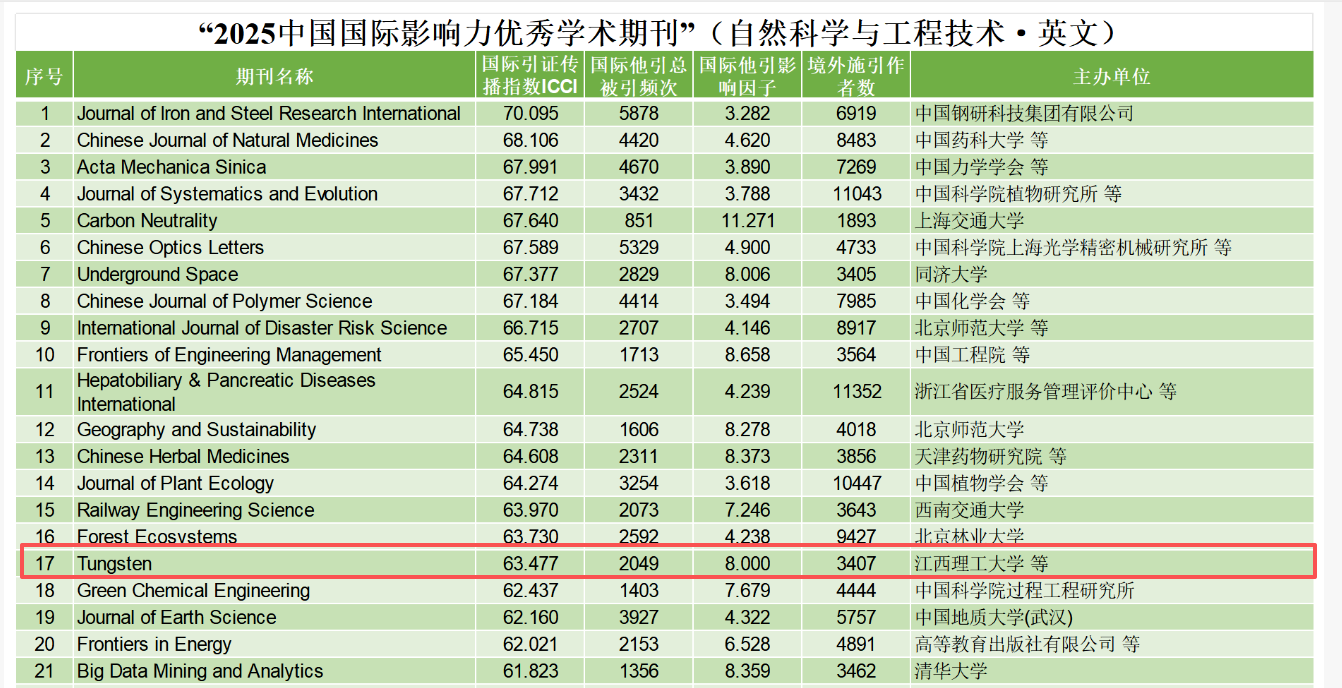 主办的《钨科技(英文)》(《Tungsten》)连续两年入选“2025中国国际影响力优秀学术期刊(自然科学与工程技术·英文)”榜单。在此次评选中,《钨科技(英文)》期刊核心指标——国际引证传播指数(ICCI)较去年取得较大进步,达63.477,在入选的150本同类别优秀期刊中位列第17位,较上一年度跃升95位。
