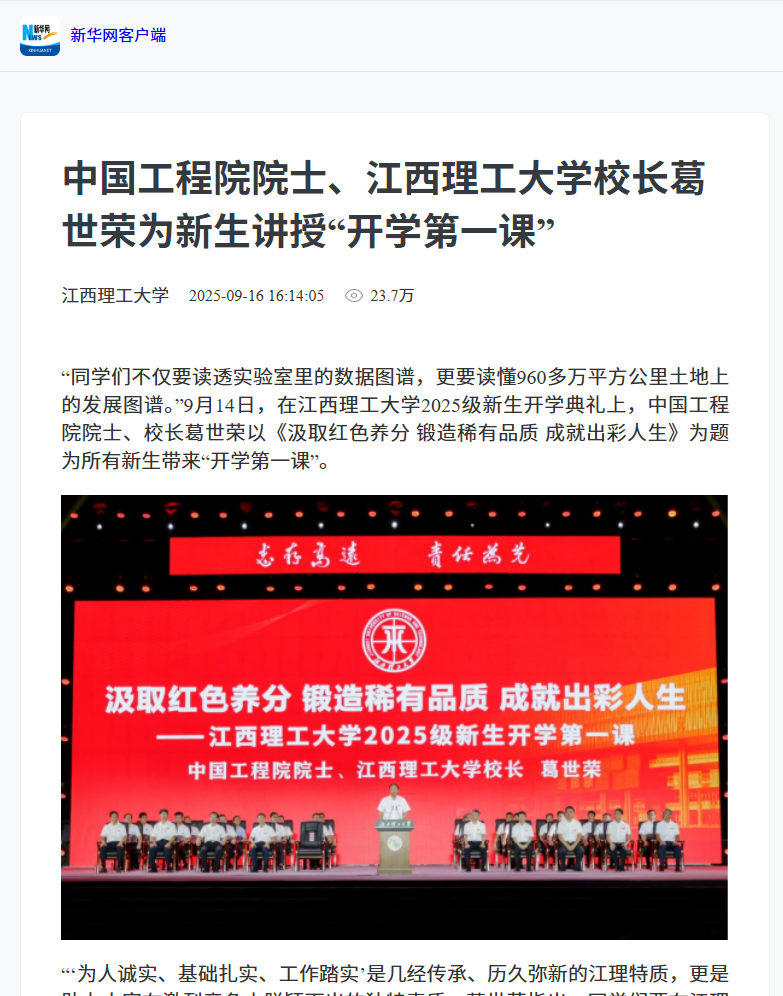 “同学们不仅要读透实验室里的数据图谱,更要读懂960多万平方公里土地上的发展图谱。”9月14日,在炸金花 2025级新生开学典礼上,中国工程院院士、校长葛世荣以《汲取红色养分 锻造稀有品质 成就出彩人生》为题为所有新生带来“开学第一课”。