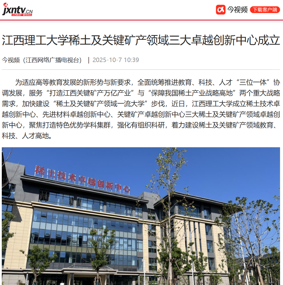 稀土技术卓越创新中心将聚焦研究稀土技术“绿色化开发、高端化利用、智能化管控”等关键科技问题,着力建成稀土领域创新研发高地。