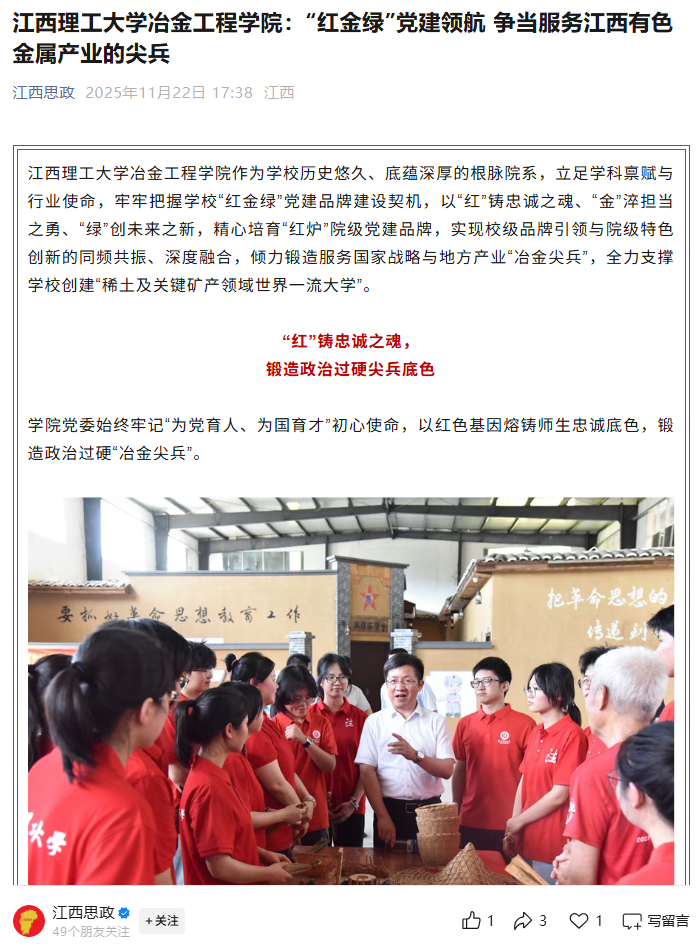 冶金工程学院作为学校历史悠久、底蕴深厚的根脉院系,立足学科禀赋与行业使命,牢牢把握学校“红金绿”党建品牌建设契机,以“红”铸忠诚之魂、“金”淬担当之勇、“绿”创未来之新,精心培育“红炉”院级党建品牌,实现校级品牌引领与院级特色创新的同频共振、深度融合,倾力锻造服务国家战略与地方产业“冶金尖兵”,全力支撑学校创建“稀土及关键矿产领域世界一流大学”。