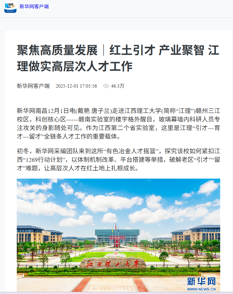 初冬,新华网采编团队来到这所“有色冶金人才摇篮”,探究该校如何紧扣江西“1269行动计划”,以体制机制改革、平台搭建等举措,破解老区“引才”“留才”难题,让高层次人才在红土地上扎根成长。