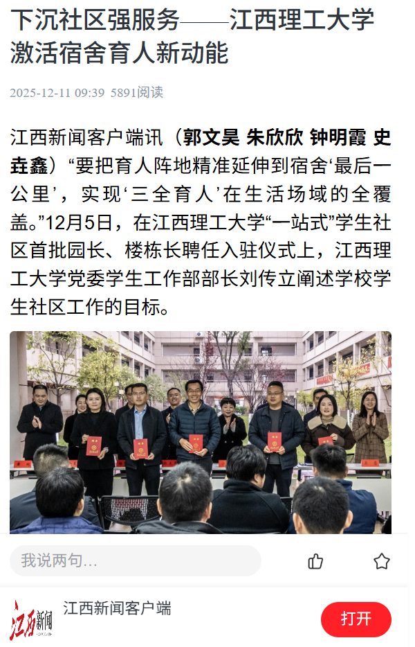首次聘任的7位学生社区园区园长以及37位学生宿舍楼栋长,进一步健全“党委学生工作部-园长-楼栋长-楼层长-寝室长”五级网格化工作格局,有效推动党政领导、专业教师、辅导员、班主任、后勤服务人员与社会力量“六支队伍”下沉到学生社区。全省“最美公寓人”、该校经济管理学院党委副书记、红旗校区园长吴媛表示,将严格落实“服务型、引领型、陪伴型”的工作定位,用实际行动筑牢“教育有温度、管理有效度”的育人共同体。