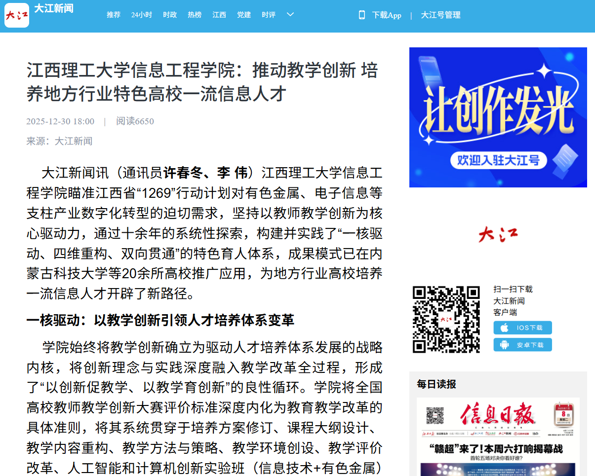 信息工程学院瞄准江西省“1269”行动计划对有色金属、电子信息等支柱产业数字化转型的迫切需求,坚持以教师教学创新为核心驱动力,通过十余年的系统性探索,构建并实践了“一核驱动、四维重构、双向贯通”的特色育人体系,成果模式已在内蒙古科技大学等20余所高校推广应用,为地方行业高校培养一流信息人才开辟了新路径。