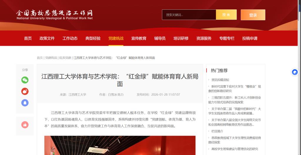 体育与艺术学院党委牢牢把握立德树人根本任务,在学校“红金绿”党建品牌统领下,以红色基因铸魂育人、以体育实践强基固本,系统构建并持续完善“党建领航、体育为基、育人为本”的高质量发展体系,奋力开创党建工作与体育育人工作深度融合、互促共进的新局面。