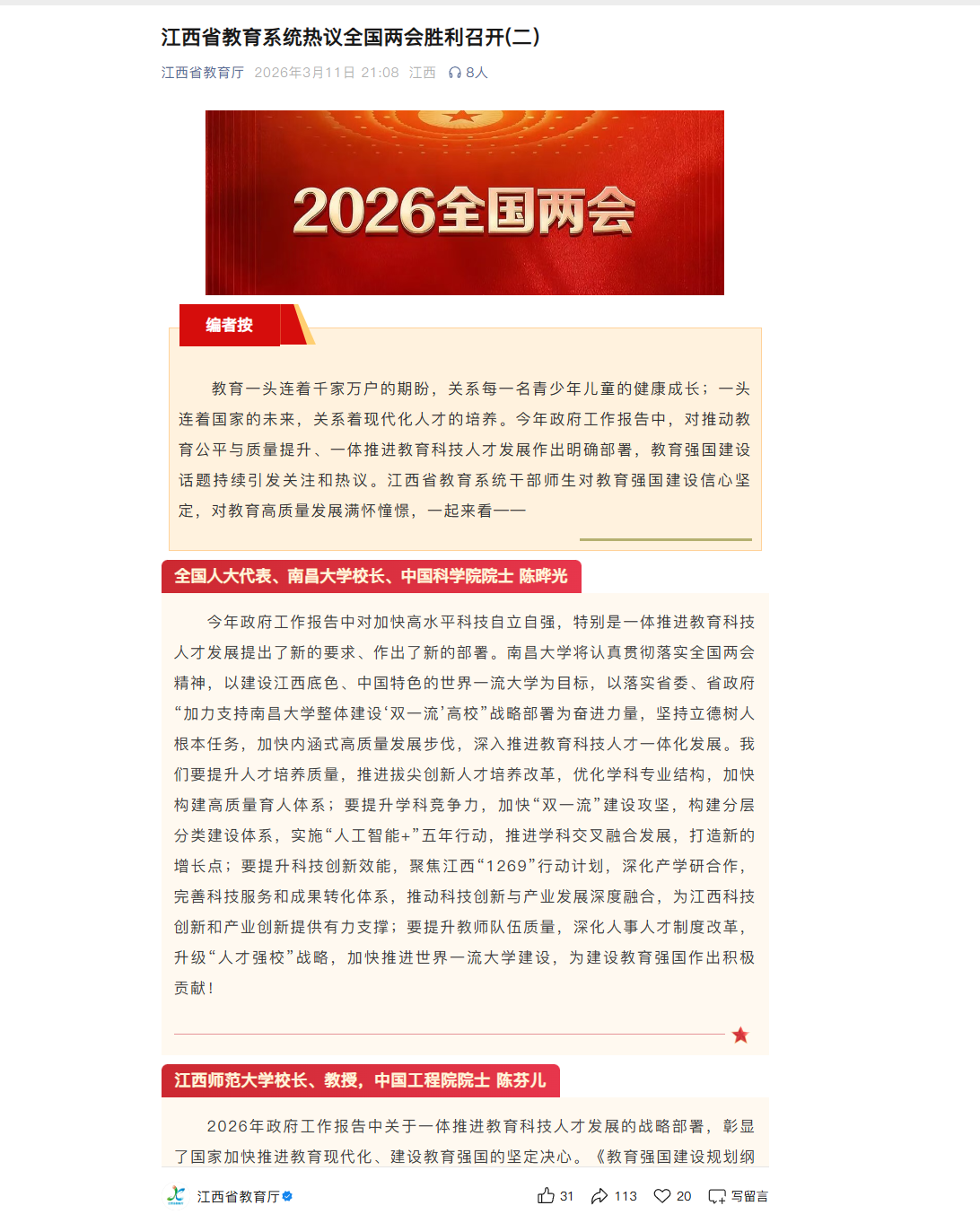 今年政府工作报告中对加快高水平科技自立自强,特别是一体推进教育科技人才发展提出了新的要求、作出了新的部署。南昌大学将认真贯彻落实全国两会精神,以建设江西底色、中国特色的世界一流大学为目标,以落实省委、省政府“加力支持南昌大学整体建设‘双一流’高校”战略部署为奋进力量,坚持立德树人根本任务,加快内涵式高质量发展步伐,深入推进教育科技人才一体化发展。我们要提升人才培养质量,推进拔尖创新人才培养改革,优化学科专业结构,加快构建高质量育人体系;要提升学科竞争力,加快“双一流”建设攻坚,构建分层分类建设体系,实施“人工智能+”五年行动,推进学科交叉融合发展,打造新的增长点;要提升科技创新效能,聚焦江西“1269”行动计划,深化产学研合作,完善科技服务和成果转化体系,推动科技创新与产业发展深度融合,为江西科技创新和产业创新提供有力支撑;要提升教师队伍质量,深化人事人才制度改革,升级“人才强校”战略,加快推进世界一流大学建设,为建设教育强国作出积极贡献!