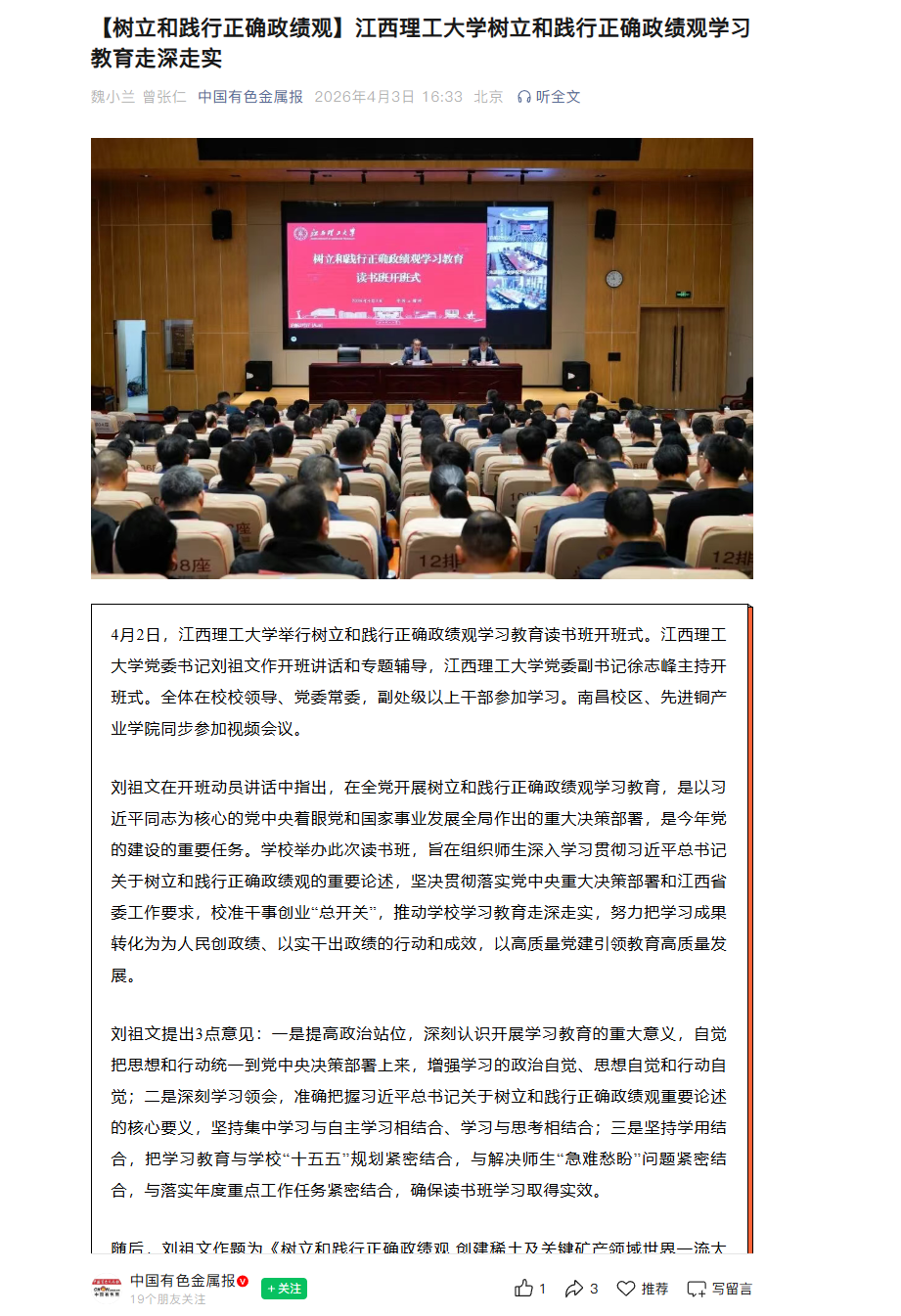 初心,把准办学方向”“树什么样的政绩——立足理工特色,彰显实干实绩”“靠什么树政绩——强化担当作为,锤炼过硬作风”3个方面结合学校实际作了系统阐释,并紧密结合学校创建稀土及关键矿产领域世界一流大学的目标,阐明了学校树立和践行正确政绩观的实践要求。报告为学校党员干部深化理论学习、强化使命担当、提升履职能力提供了有力指导,也为师生坚守办学初心、彰显实干实绩、强化担当作为指明了方向、提供了遵循。