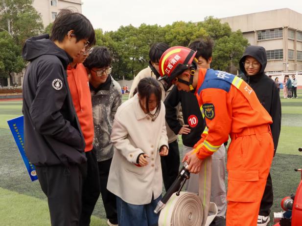 消防器材展示区俨然一座生动的微型“安全科技馆”。消防员们身着消防服,依次向师生演示了灭火器、消防服、水带等关键消防器材的操作方法。他们将实操融入演示中,原本枯燥的安全知识在讲解中“活”了过来,让在场师生直观感受到消防器材在危急时刻的重要作用。