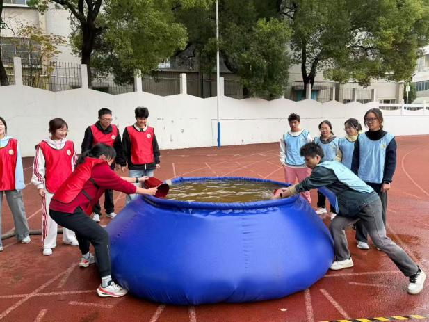 赛道上,“远程供水”项目正在紧张进行。队员们从模拟水池中舀水,带着水桶在赛道上奋力奔跑,将水精准倒入远处的刻度桶。运动员的喘息声与观众此起彼伏的“加油”呐喊声交织在一起,形成一曲充满力量与激情的青春交响乐,考验着团队间的协作效率与送水过程中的稳定性。