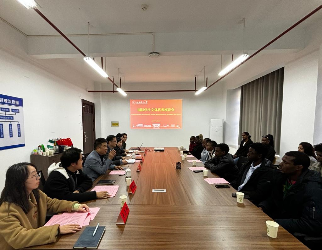 举行国际学生文体代表座谈会。校党委常委、副校长熊志华出席会议,国际教育学院院长蔡进宝主持会议,国际教育学院副院长肖静、全体教师以及在省级汉语大赛、校运会、“海汇国际合唱团”及“好人好事”中表现突出的国际学生代表共同参加。