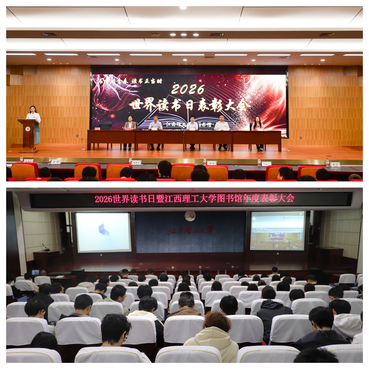在三江和南昌两校区同步举行2026年世界读书日暨“阅读之星”表彰大会。副校长汪航,校党委常委、宣传部长汪锋锁出席大会,图书馆、党委学生工作部、校团委、南昌校区管委会及相关学院负责人参加大会。会议由图书馆副馆长李轶主持。